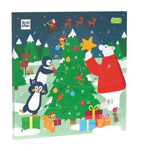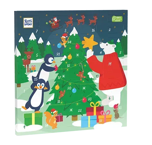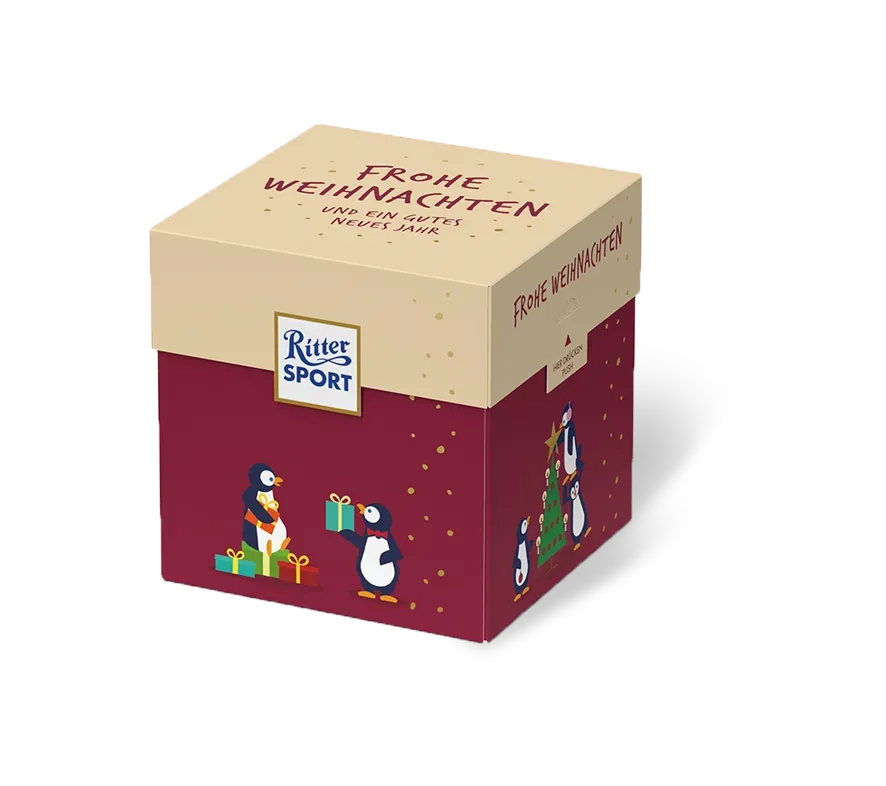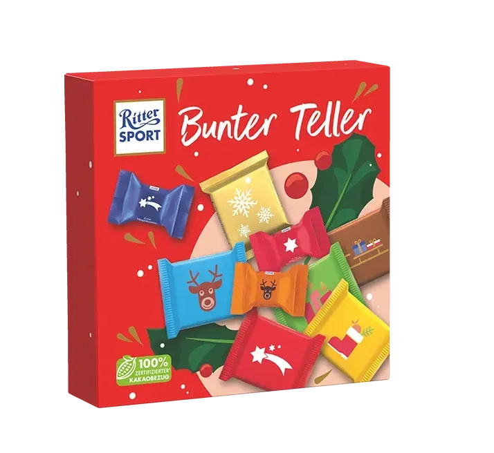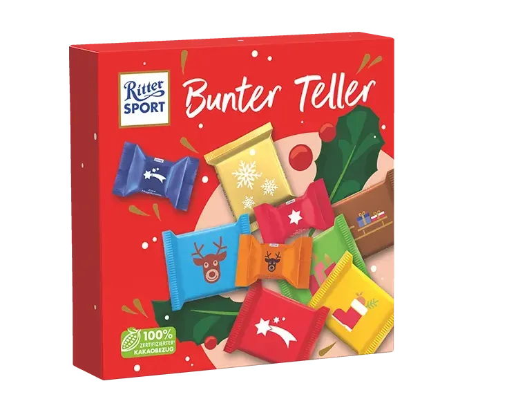 Profitieren Sie von unserer Vielzahl an weihnachtlichen Produkten. Gefüllt mit bester, zu 100% zertifiziert nachhaltig bezogener Schokolade und in den beliebten Ritter Sport Sorten ist hier für jeden das richtige Geschenk dabei. Machen Sie die Weihnachtszeit 2025 zu einer ganz besonderen.
